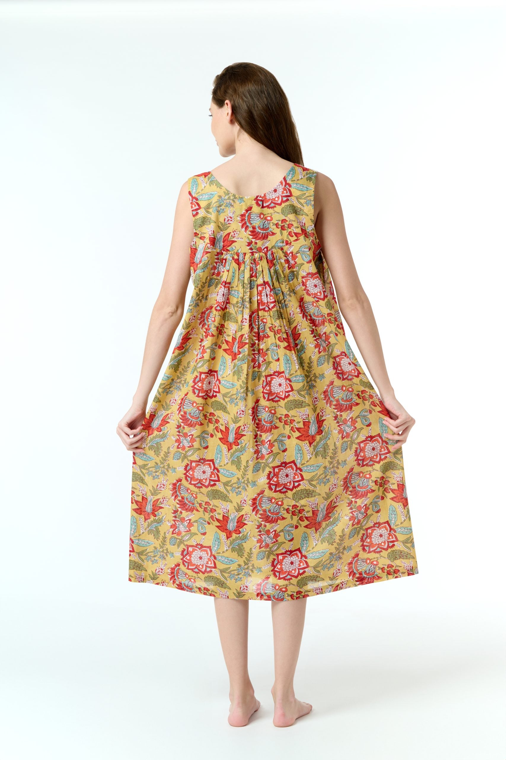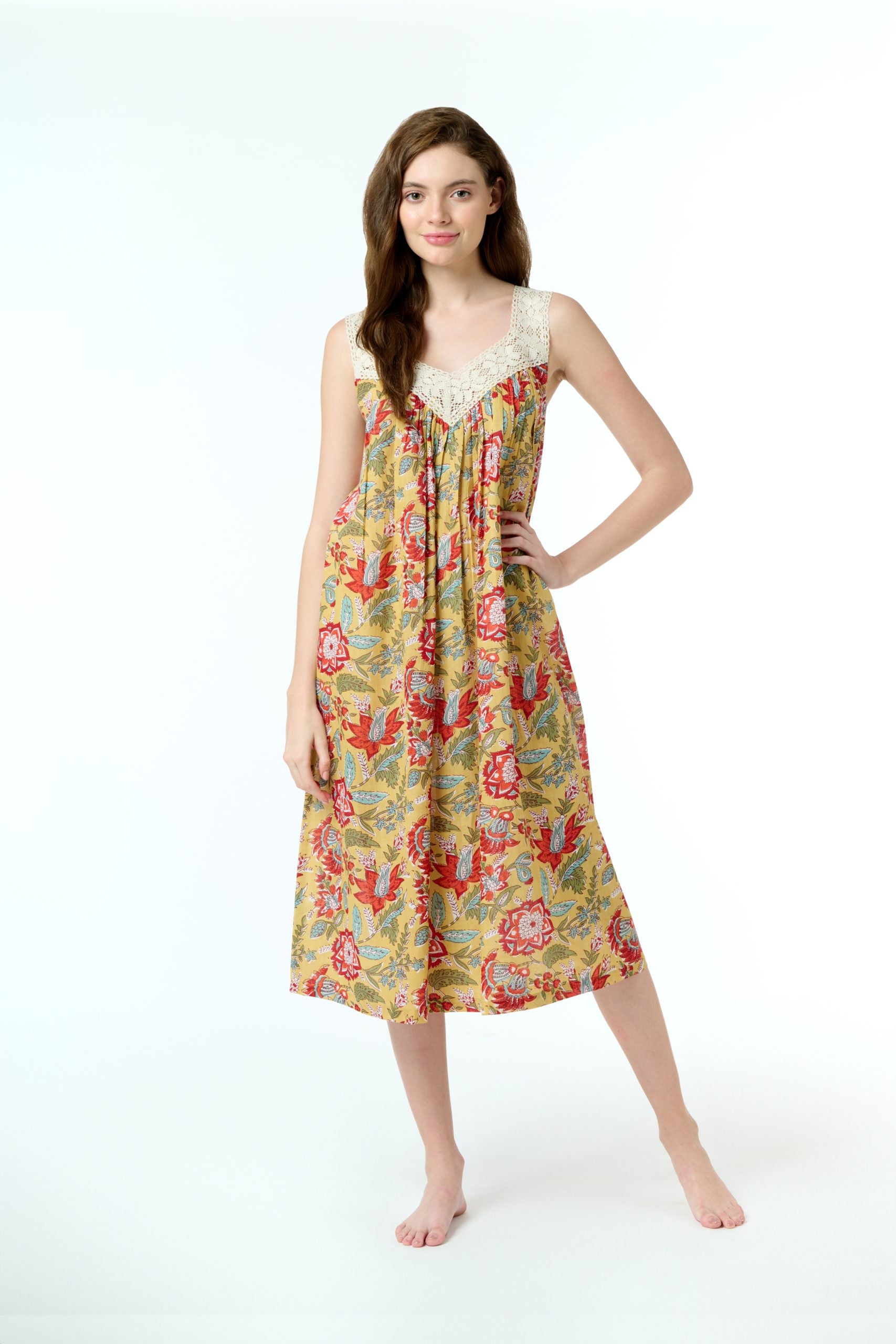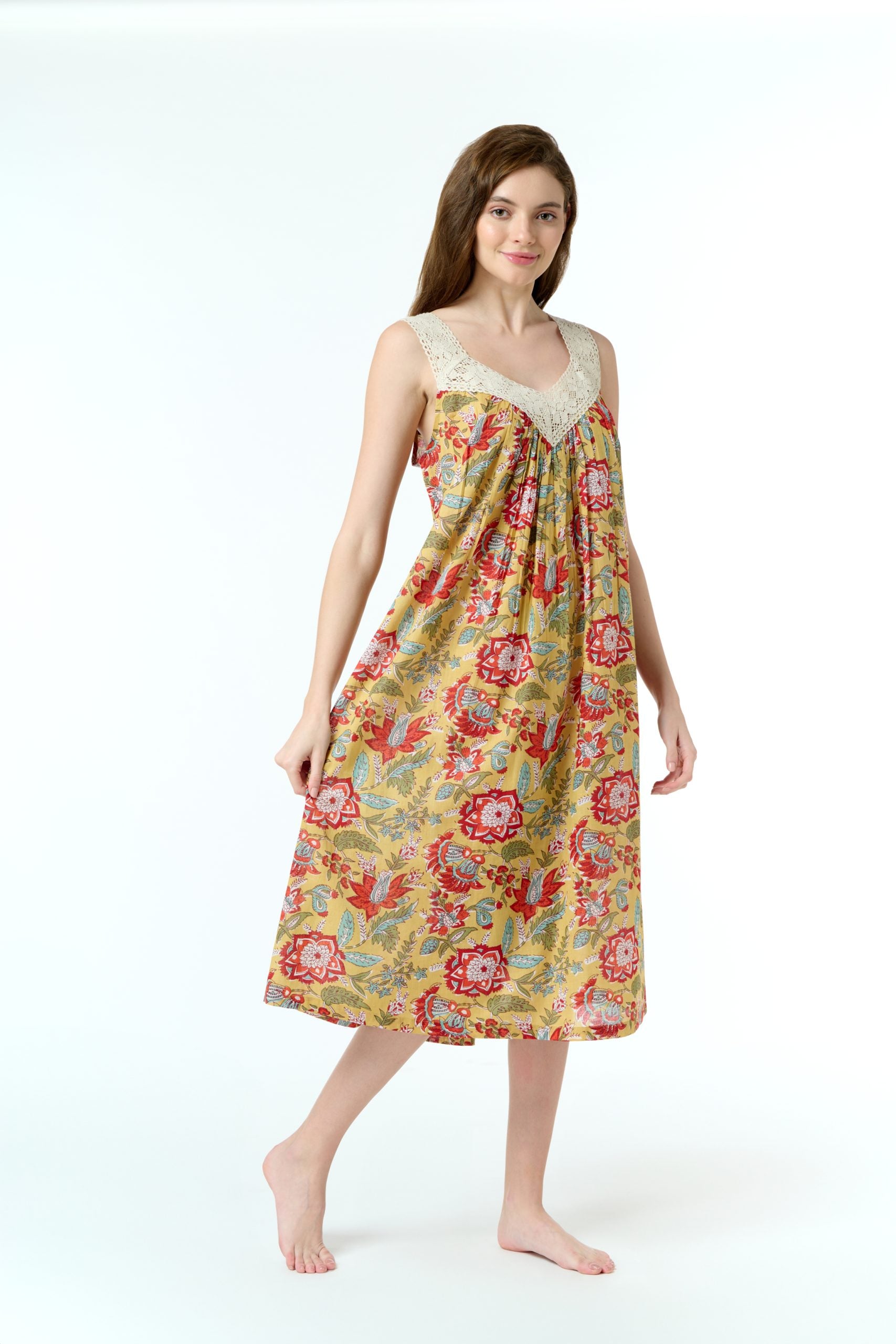 We just love these gorgeous cotton nighties. This one comes in a gorgeous mustard with florals print with a v-neck lace trim around the neckline.