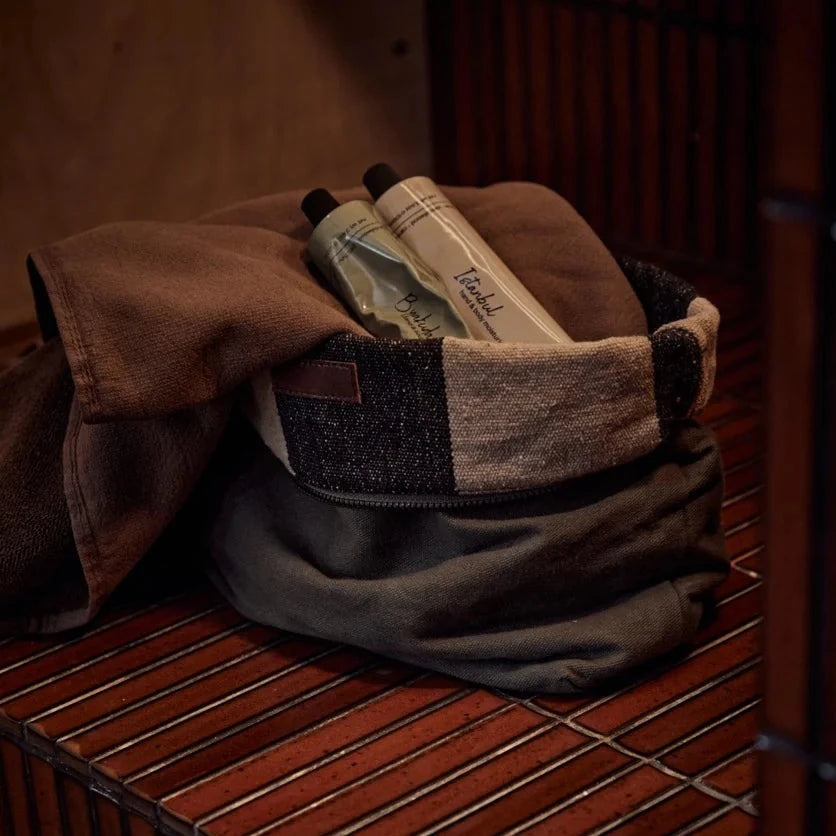 Featuring a striped woven cotton lining that is designed to be folded down and on display as well as genuine leather detailing, the Journey Bag is designed for all your toiletry needs.