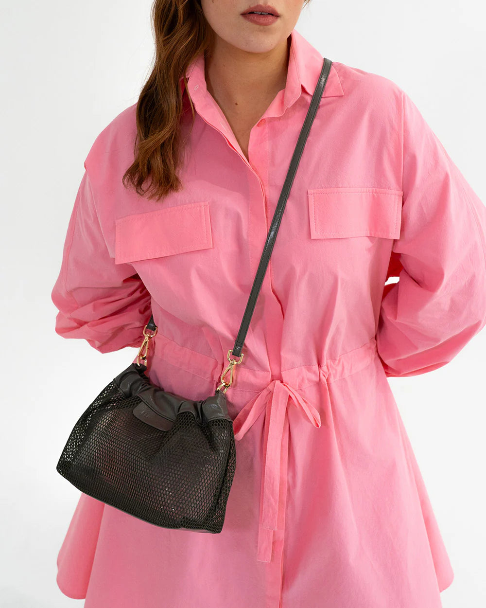 The Monty Bag is crafted from poly mesh with premium PU trim and features a soft, pillowy body construction. Designed for versatility, it can be carried as a clutch or worn with the removable shoulder strap. A hidden magnetic closure secures the bag, opening to reveal a spacious central compartment with a durable PU base.