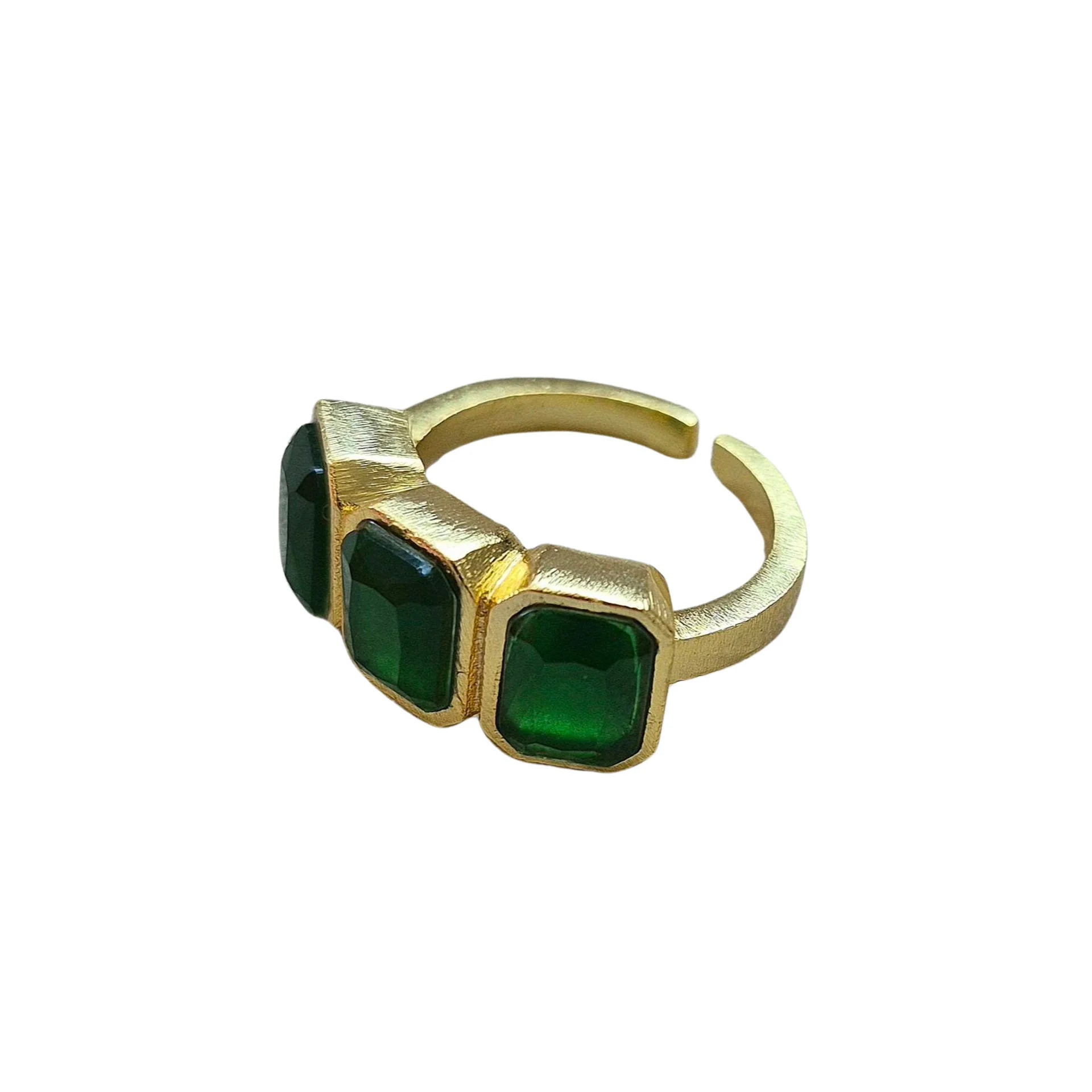Introducing the Natural Green Stone Ring. This elegant and stylish piece features 3 natural green stones set in a matte gold plated band. The adjustable back allows for a perfect fit on any finger.