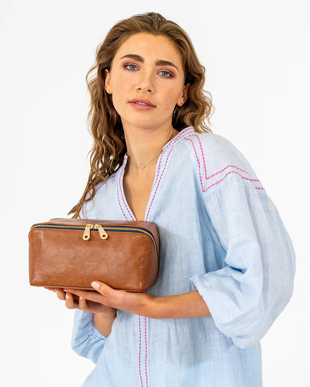 The Elms+King Washbag opens to reveal a spacious interior and two elasticated pockets. Lined with our signature brand lining, you will never lose track of your favourite items. Made from premium GRS polyurethane (PU) with 14-karat light gold-plated hardware the washbag will keep all your beauty essentials in good order.