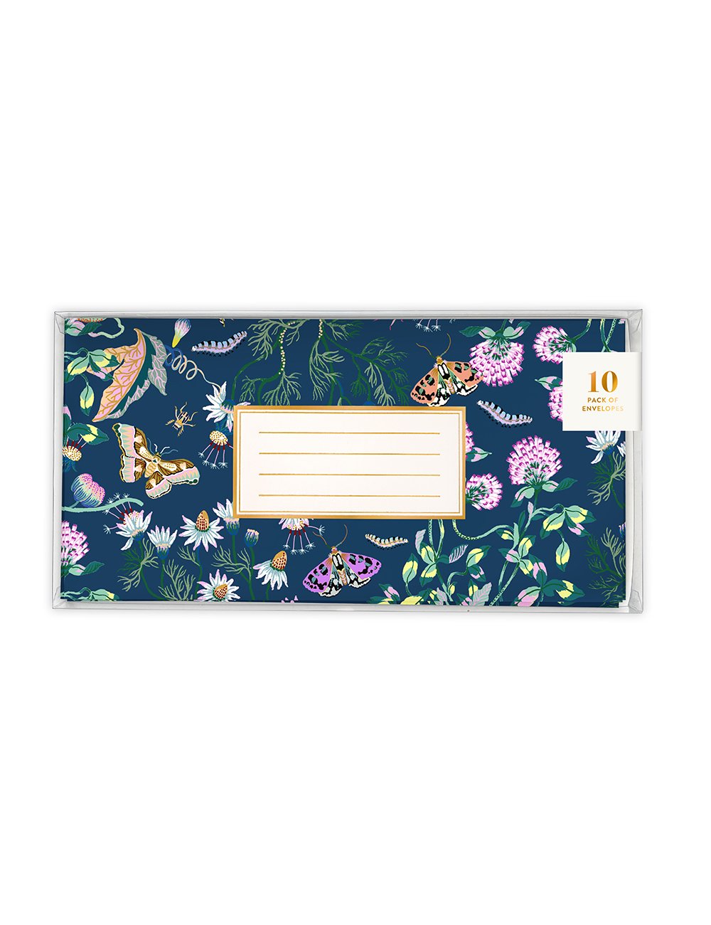 Gold foiled address box to front and return to sender address box to rear.